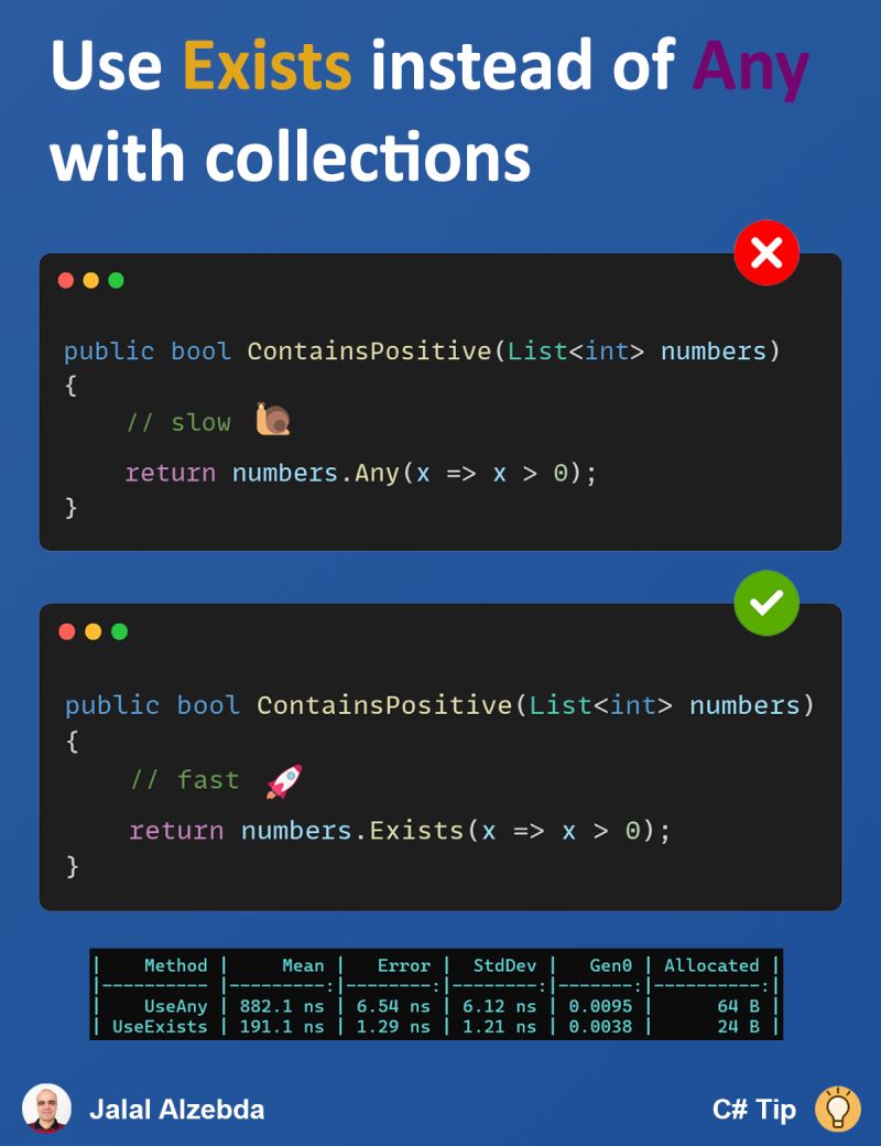 🚀 𝗘𝘅𝗶𝘀𝘁𝘀 is generally faster than Any. This is because Exists can take advantage of the internal implementation of List<T> to perform the check more efficiently. Exists doesn't require the overhead of creating an enumerator that Any does.